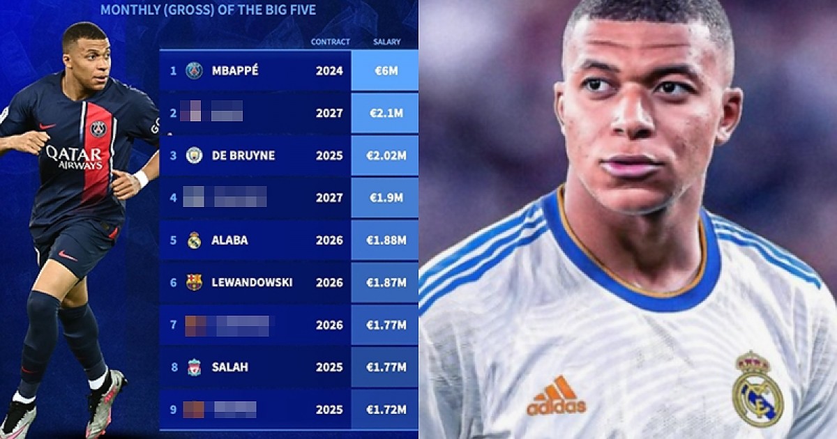 음바페의 월 수입은 600만 유로 (한화 약 86억원)로 1위를 차지했다.