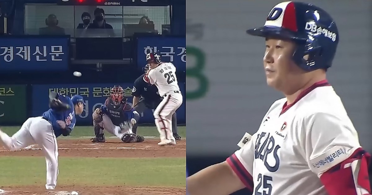 류현진이 평소에 던지지 않던 공을 받아 당황한 양의지.mp4