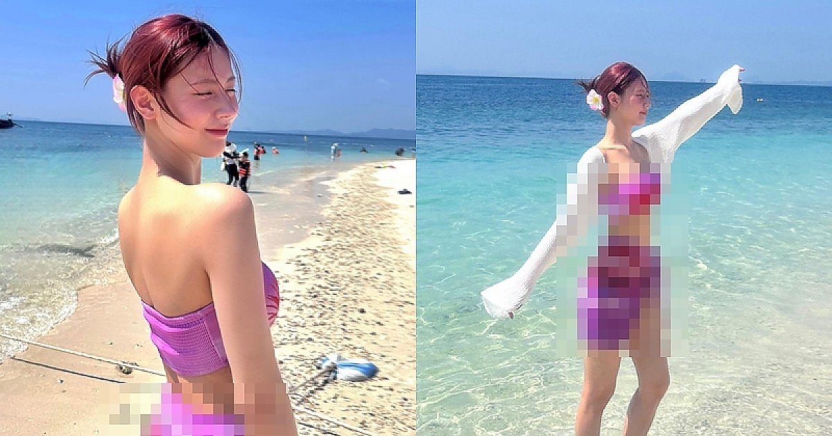 바닷가에서 핑크색 튜브탑 비키니 입은 아이들 조미연 몸매