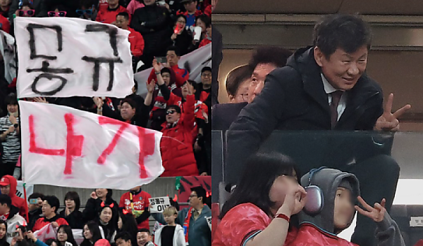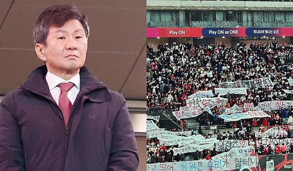 팬들과 찰칵찰칵..."정몽규 나가" 퇴진 시위에도 웃었다...