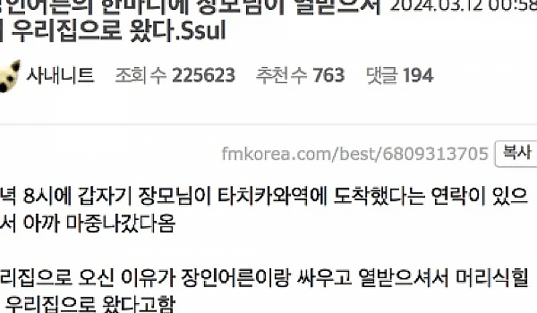 장인어른의 한마디에 장모님이 열받아서 사위집으로 온 이유