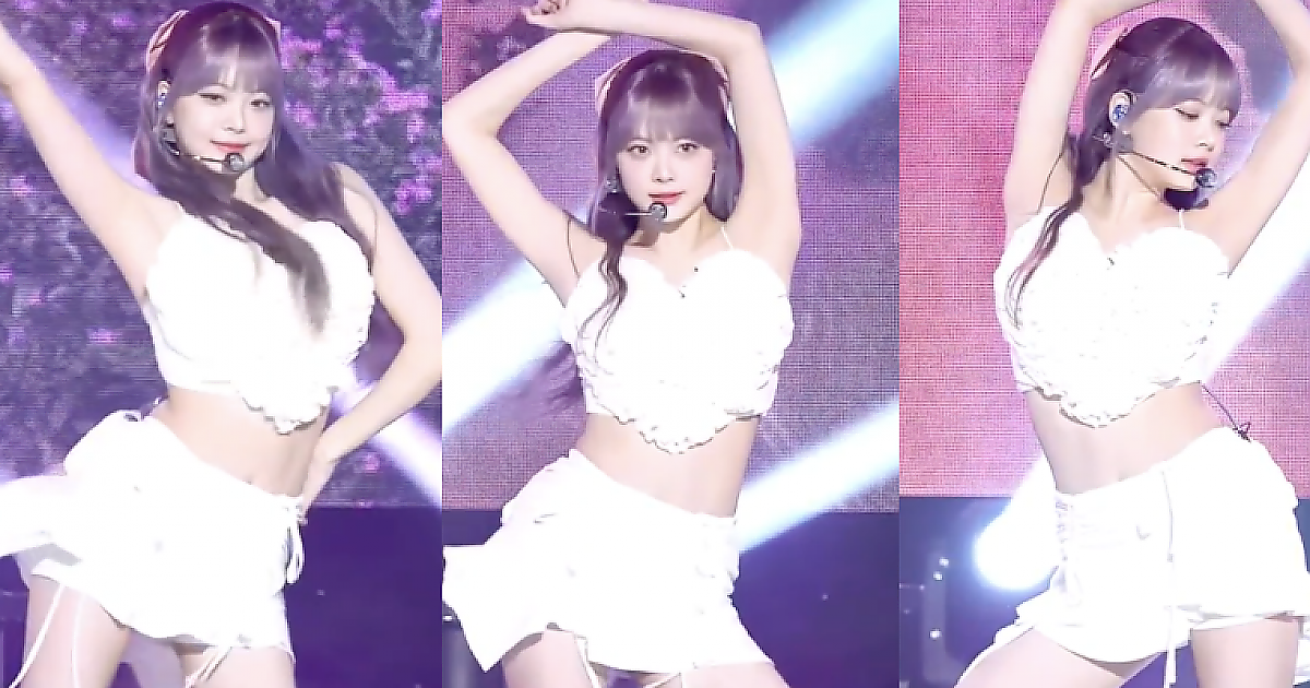 순백의 투피스 의상 11자 복근이 선명한 '르세라핌 홍은채'