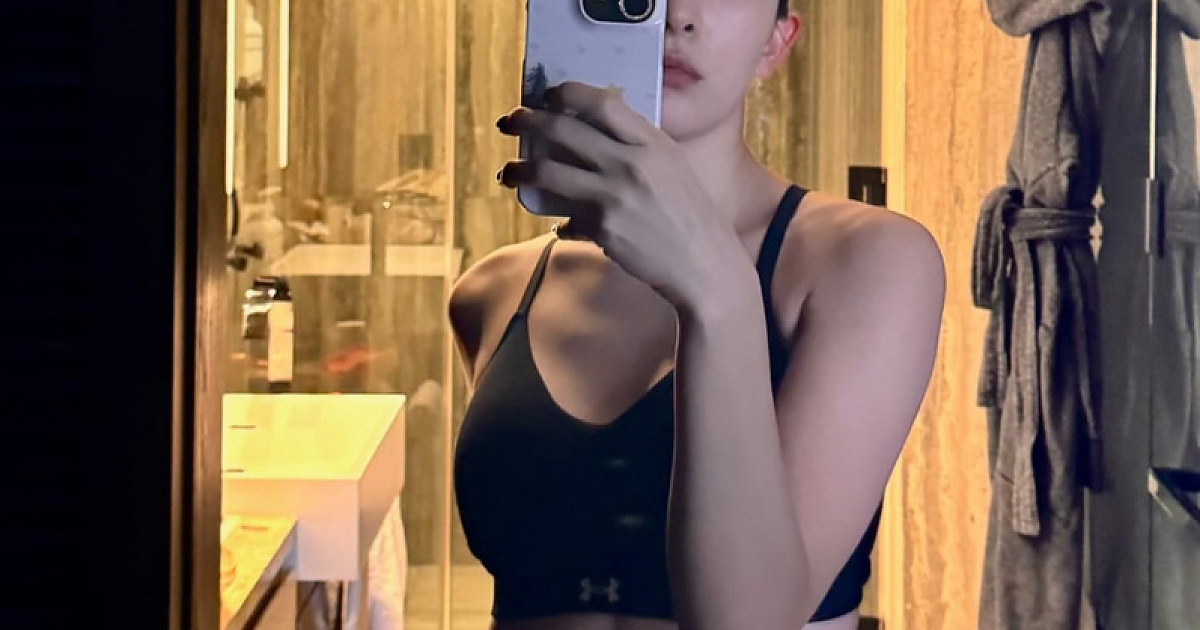 언더아머 스포츠브라 + 레깅스 입고 거울 셀카 찍은 슬기 꿀복근