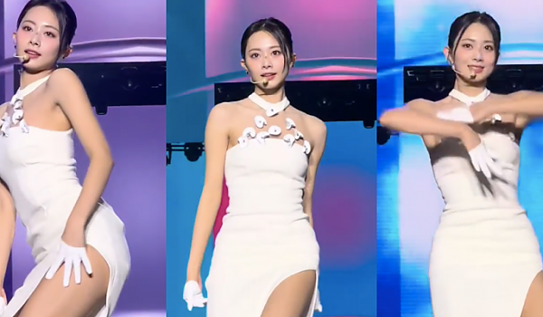 옆트임 화이트 드레스 한쪽 허벅지를 시원하게 드러낸 트와이스 쯔위