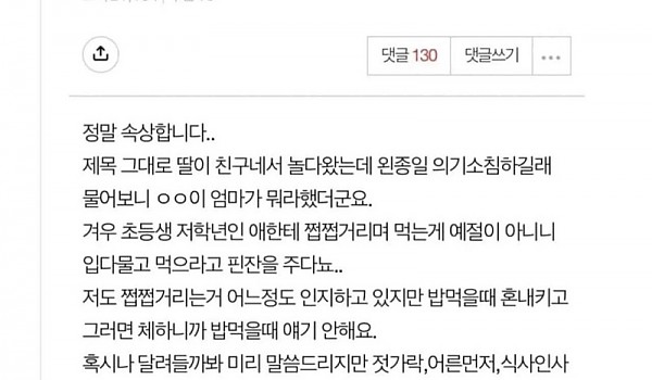 딸이 친구네서 쩝쩝 거린다며 혼나고 왔네요