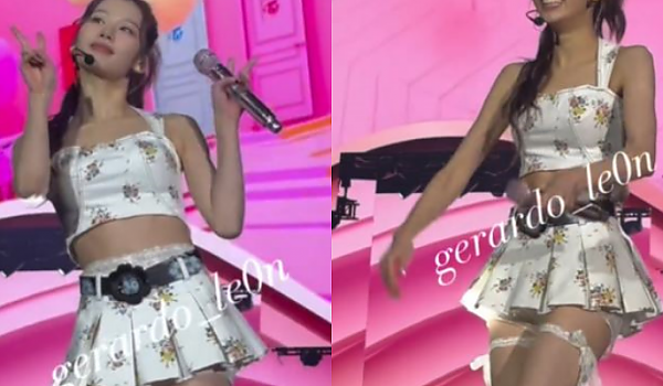 허벅지에 달린 레이스 리본과 치마가 잘 어울리는 트와이스의 '사나'(영상)