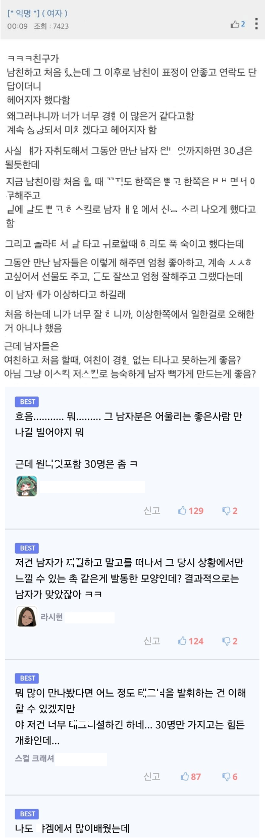 친구가 남친이랑 첨 했는데 여친이 너무 잘해서 생긴 일