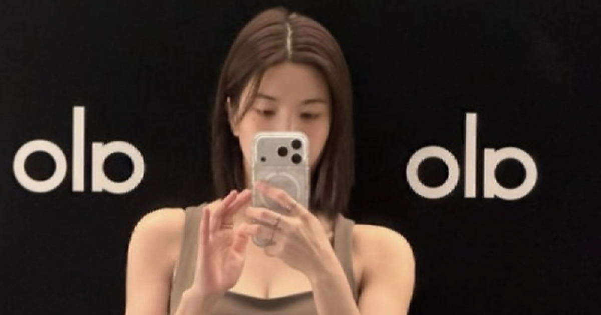 브라톱과 레깅스를 입고 거울 셀카를 찍으며 완벽한 '오운완' 인증샷을 남겼습니다.
