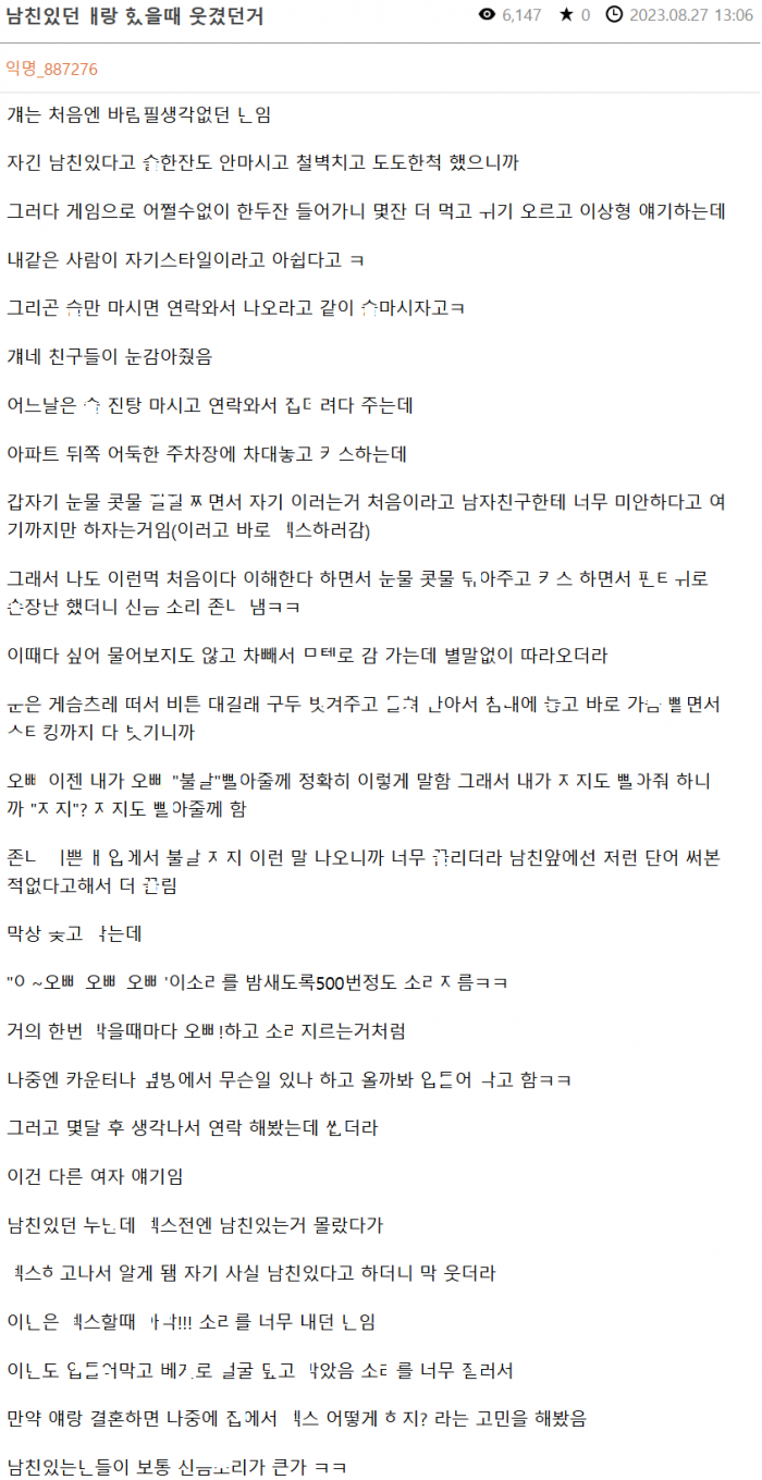 남친 있던 여ㅈ..r와 ㅅㅅ했을때 웃겼던거.jpg