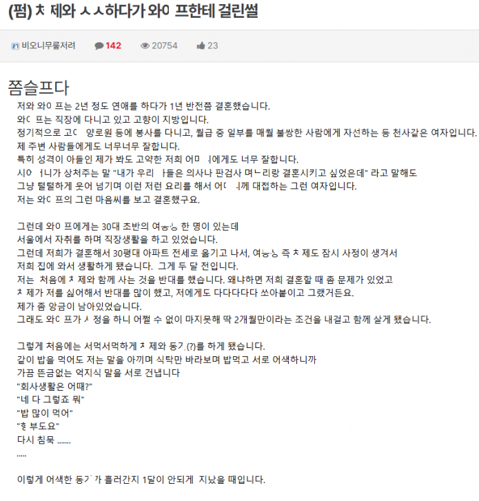 사이 안좋던 ㅊ제와 ㅅㅅ 하다가 와잎한테 걸린 남자