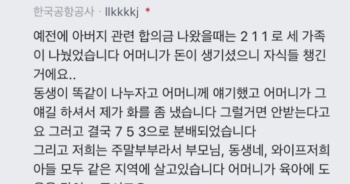 3. 시어머니가 시어머니+손자 보상금을 본인, 큰아들, 남동생 5:5:5로 나누자고함
