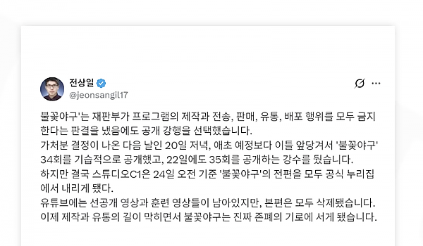 판결 이후에도 공개 강행 불꽃야구, 결국 본편 모두 삭제 ㄷㄷ