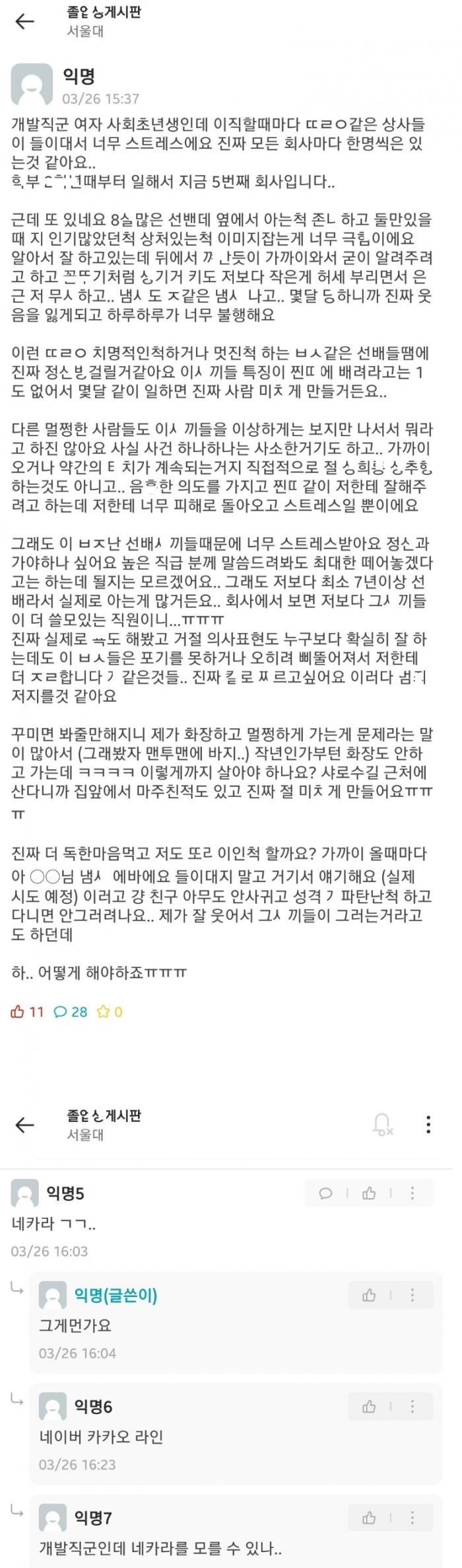 발ㅈ난 상사들 때문에 ㅁㅊ겠다는 서울대녀