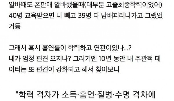 학력이 낮을 수록 담배를 피나?