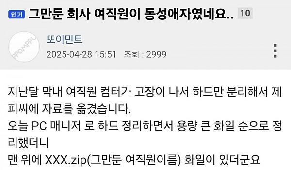 그만둔 회사 여직원이 동성애자였네요..