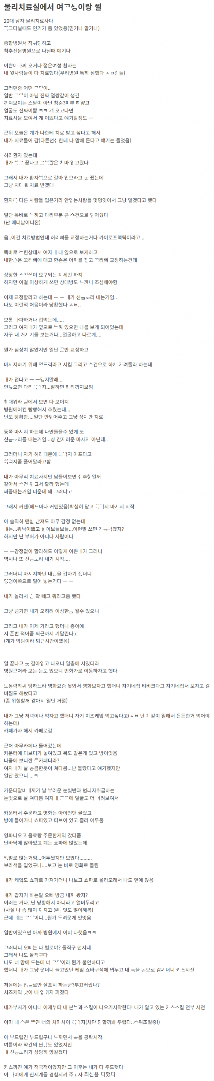 물리치료 해주던 ㅇㄱㄷ이 ㅁ어달라고 하는것 같길래 ㅈㅈ ㅂ아준 이야기