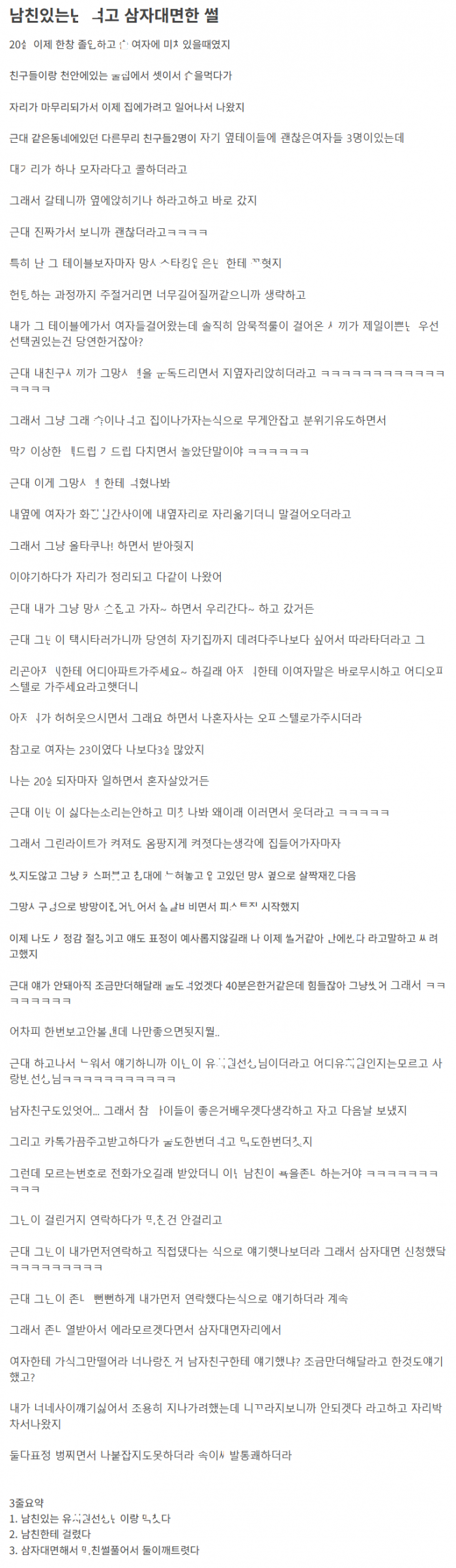 남친 있던 여선ㅅ님 헌ㅌ해서 ㄸㅁ었다가 갸 남친이랑 삼자대면한 썰
