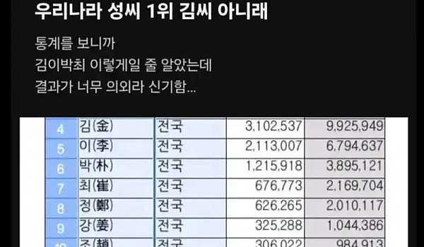 우리나라 성씨 1위 김씨 아니래