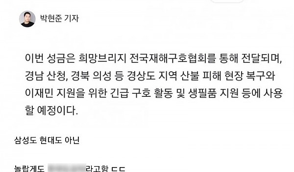 국내기업 최초로 경상도에 성금 보낸 기업 ㄷㄷ