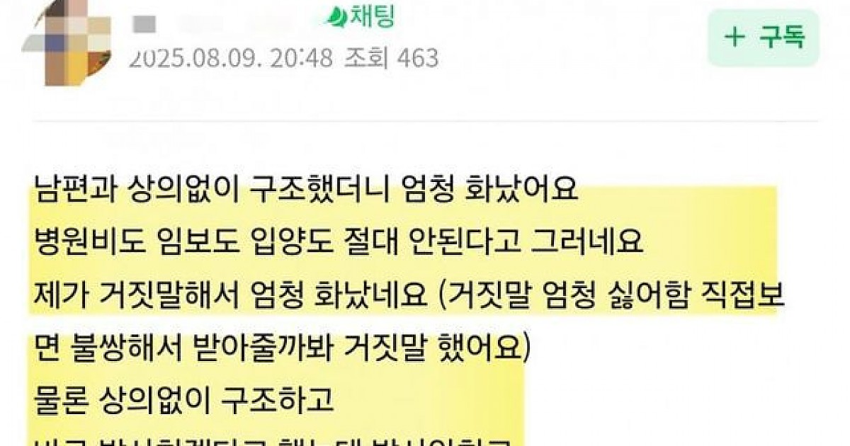 남편 몰래 거짓말하고 구조했더니 화내요ㅠㅠ