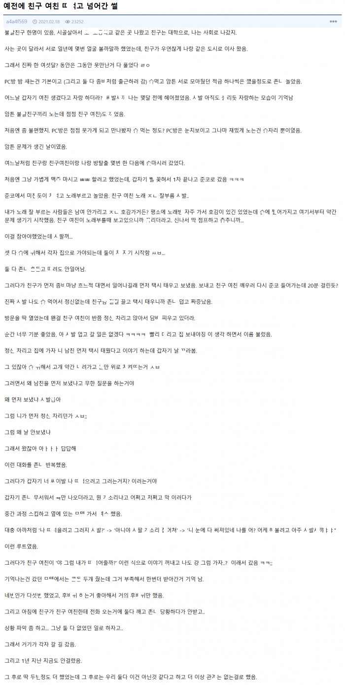 자기 여친을 챙기지 않았던 친구 몰ㄹ 친구여친이 대ㅈ던 이야기